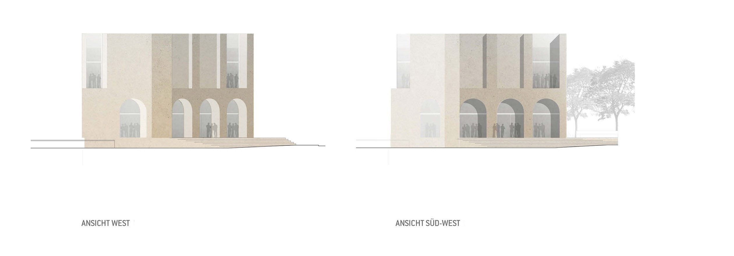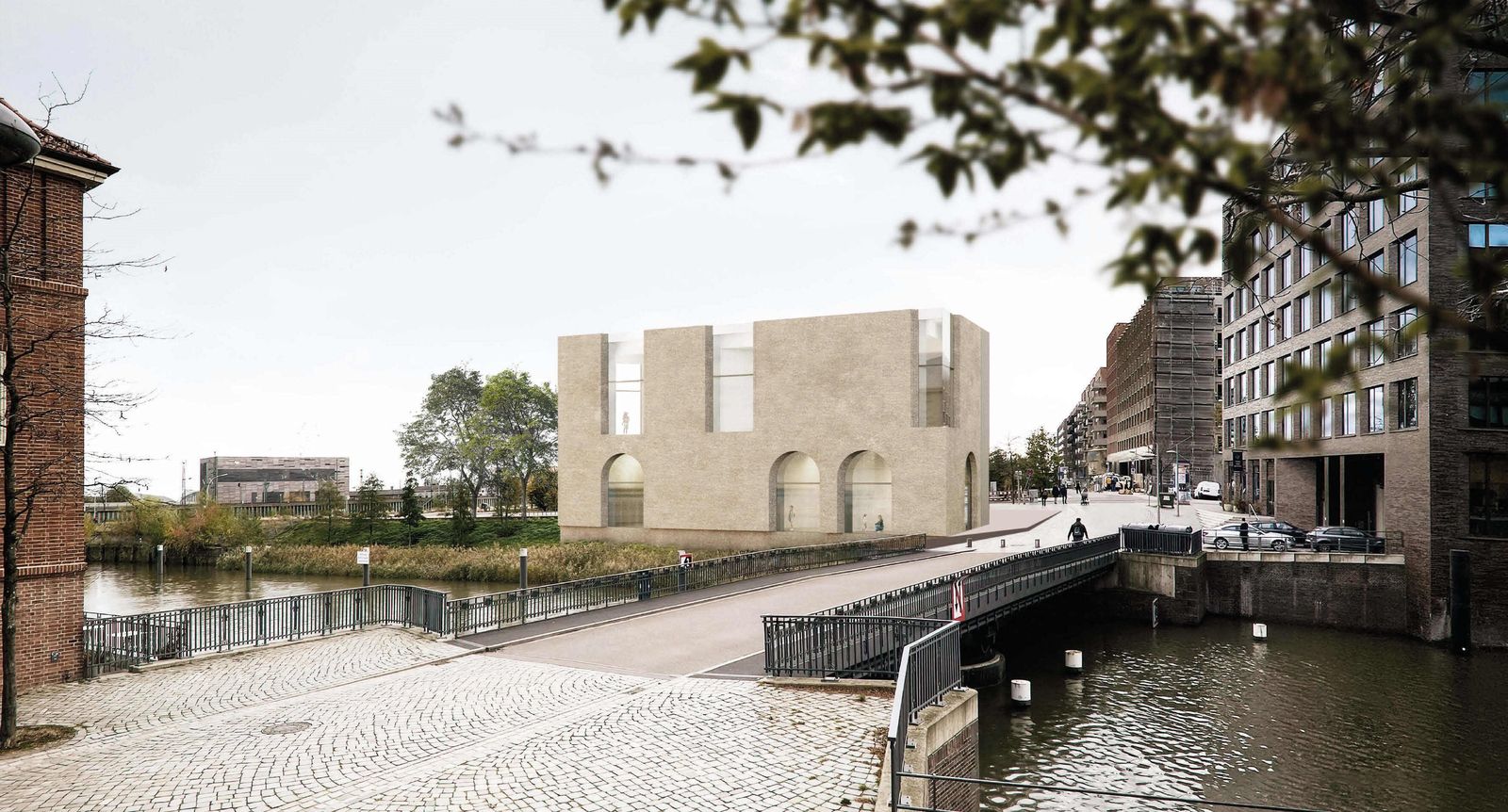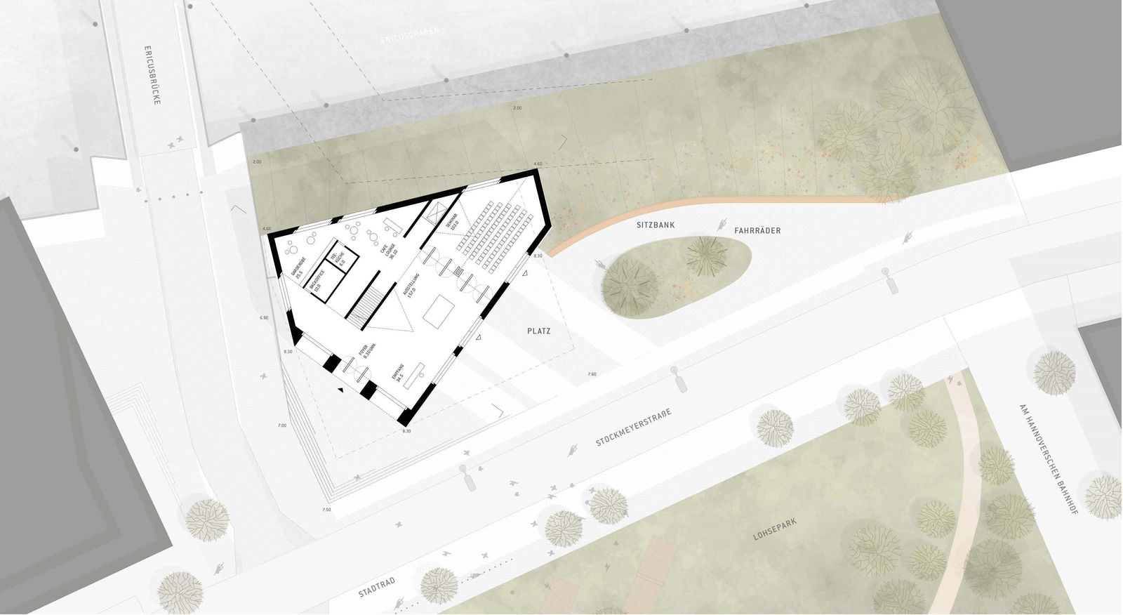 Der Ort für das Dokumentationszentrum liegt am Übergang zwischen Lohsepark und Ufersaum zum Ericusgraben. Er ist von zahlreichen Stadtperspektiven erlebbar – mit Nah- und Fernwirkung aus unterschiedlichsten Höhenniveaus. Der Ort ist auch in historischer Sicht prägnant am „Drehpunkt“ zwischen den ehemaligen Gleisanlagen und der Ericusbrücke, einer früheren Drehbrücke. Mit unserem Entwurf für den neuen Solitär nehmen wir Bezug auf die Erinnerungslandschaft für den Hannoverschen Bahnhof mit der Fuge und dem Abdruck des Lohseplatzes, auf die unterschiedlichen Geometrien der historischen Schichten und der heutigen Stadt, auf die zahlreichen Blickwinkel und Sichtbeziehungen und auch auf das ehemalige Zollhaus als Pendant am gegenüberliegenden Ufer des Ericusgrabens. Zentrale Idee für das Dokumentationszentrum Hannoverscher Bahnhof ist der Baukörper als Fragment mit seiner Ausrichtung der Hauptfassaden zum ehemaligen Hannoverschen Bahnhof. Die Eingangsseite spiegelt das Portal des Bahnhofs als Sichtbetonskulptur und gibt als narratives Element die Dimension der Fassadenordnung vor. Der umlaufende Baukörper mit facettenreicher Geometrie erhält eine helle Sichtbetonfassade mit großzügigen Fensteröffnungen an besonderen Blickpunkten.